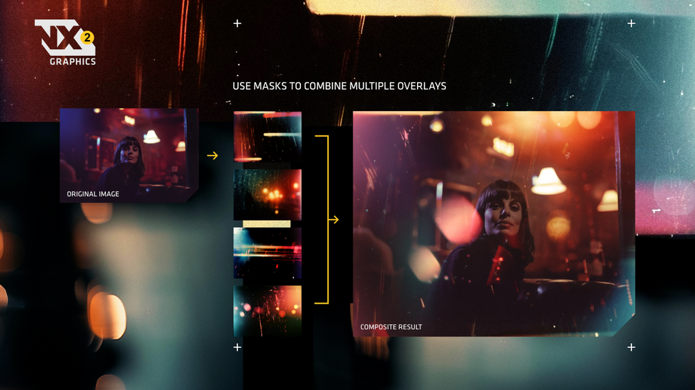 Easy to use and straightforward, simply drag any overlay onto a new layer and play with blending modes to discover the perfect effect. Each image captures the imperfections and light leaks reminiscent of old video recordings, delivering a cinematic, lo-fi touch to your work.